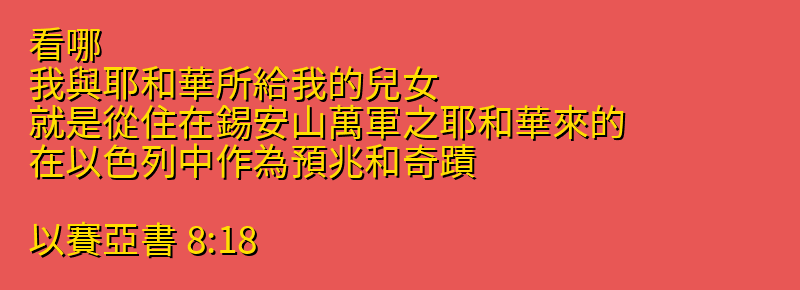 看哪、我與耶和華所給我的兒女、就是從住在錫安山萬軍之耶和華來的、在以色列中作為預兆和奇蹟。