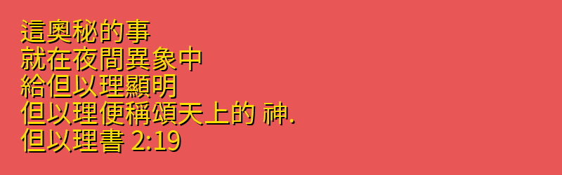 這奧秘的事、就在夜間異象中、給但以理顯明。但以理便稱頌天上的 神.