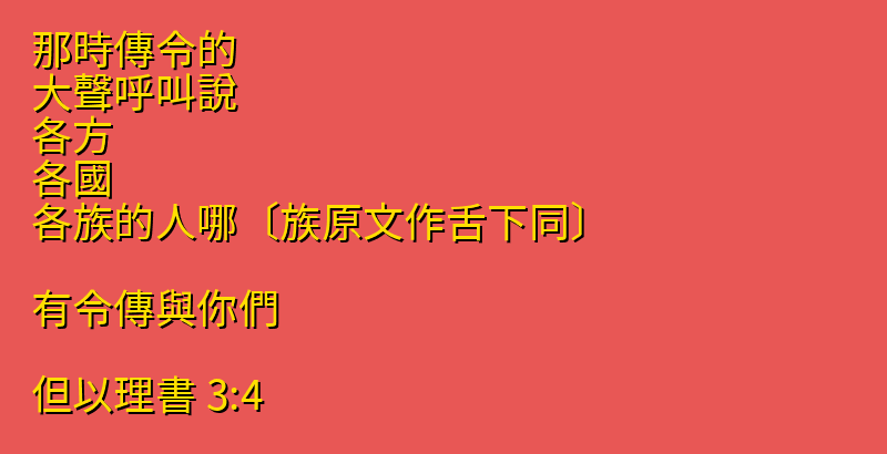 那時傳令的、大聲呼叫說、各方、各國、各族的人哪〔族原文作舌下同〕、有令傳與你們。