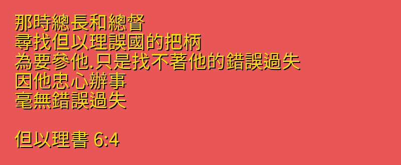 那時總長和總督、尋找但以理誤國的把柄、為要參他.只是找不著他的錯誤過失、因他忠心辦事、毫無錯誤過失。
