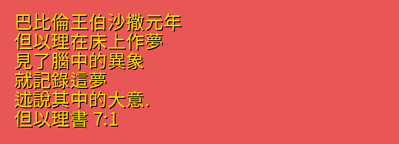 - 7:1 巴比倫王伯沙撒元年、但以理在床上作夢、見了腦中的異象、就記錄這夢、述說其中的大意.