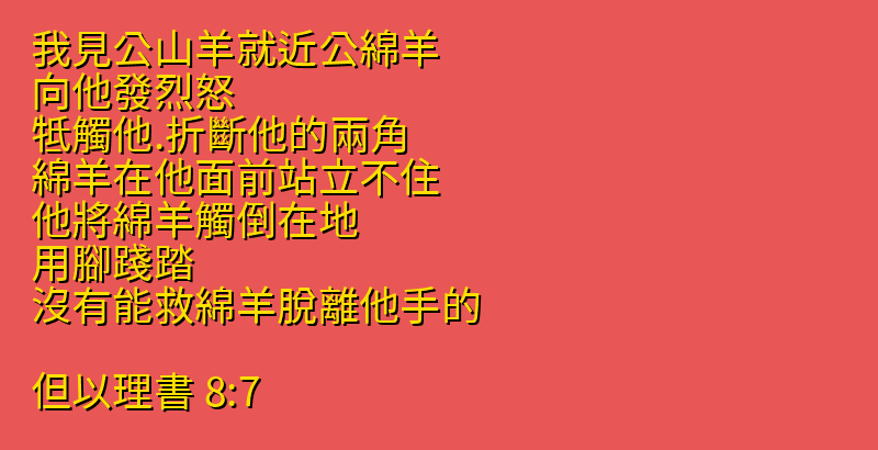 我見公山羊就近公綿羊、向他發烈怒、牴觸他.折斷他的兩角、綿羊在他面前站立不住、他將綿羊觸倒在地、用腳踐踏、沒有能救綿羊脫離他手的。