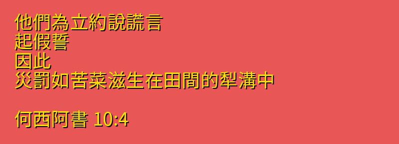 • 10:4 他們為立約說謊言、起假誓、因此、災罰如苦菜滋生在田間的犁溝中。