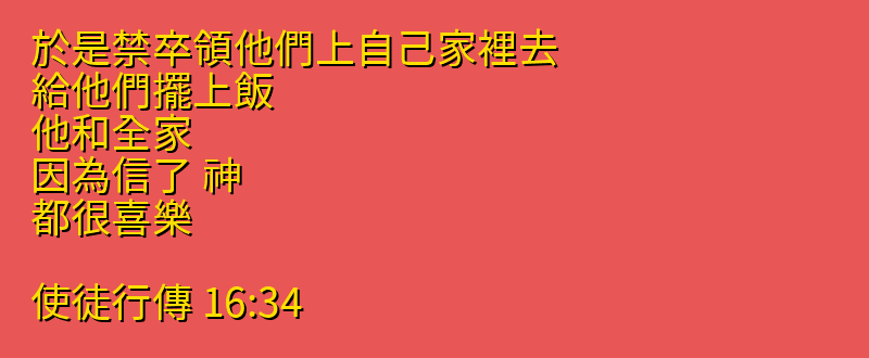 今日分享的中文聖經:「於是禁卒領他們上自己家裡去、給他們擺上飯、他和全家、因為信了 神、都很喜樂。」來自聖經「使徒行傳」第「16章34節」,你可以繼續向下拉看到聖經卷書完整章節。每日中文聖經從神的話語中聆聽神的聲音,引導我們的人生,指導我們人生的方向,讓我們做出正確的選擇,而做出這些正確選擇的原則都在聖經中,所以我們需要讀神的話語,認識他的話語,把神的話語藏在心裡。
