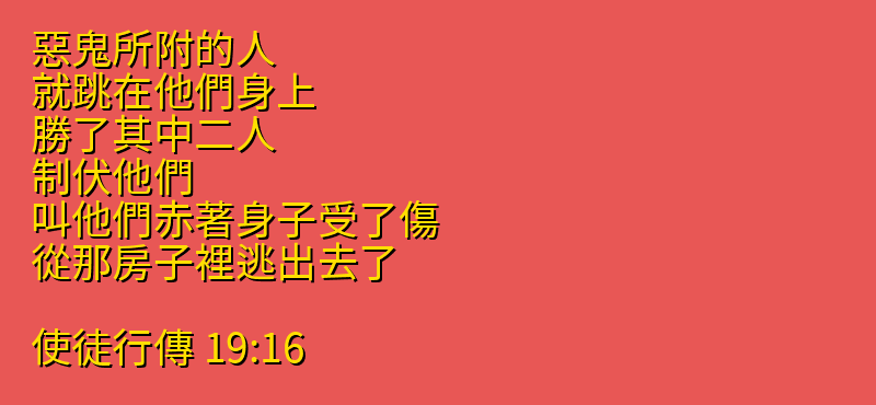 今日分享的中文聖經:「惡鬼所附的人、就跳在他們身上、勝了其中二人、制伏他們、叫他們赤著身子受了傷、從那房子裡逃出去了。」來自聖經「使徒行傳」第「19章16節」,你可以繼續向下拉看到聖經卷書完整章節。每日中文聖經從神的話語中聆聽神的聲音,引導我們的人生,指導我們人生的方向,讓我們做出正確的選擇,而做出這些正確選擇的原則都在聖經中,所以我們需要讀神的話語,認識他的話語,把神的話語藏在心裡。