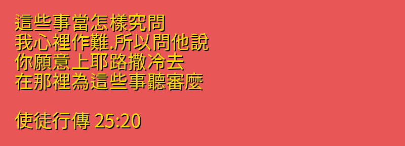 今日分享的中文聖經:「這些事當怎樣究問、我心裡作難.所以問他說、你願意上耶路撒冷去、在那裡為這些事聽審麼。」來自聖經「使徒行傳」第「25章20節」,你可以繼續向下拉看到聖經卷書完整章節。每日中文聖經從神的話語中聆聽神的聲音,引導我們的人生,指導我們人生的方向,讓我們做出正確的選擇,而做出這些正確選擇的原則都在聖經中,所以我們需要讀神的話語,認識他的話語,把神的話語藏在心裡。
