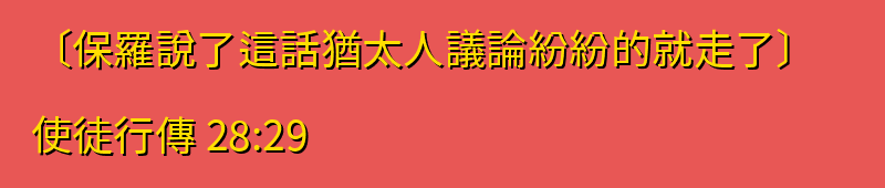 今日分享的中文聖經:「〔保羅說了這話猶太人議論紛紛的就走了〕」來自聖經「使徒行傳」第「28章29節」,你可以繼續向下拉看到聖經卷書完整章節。每日中文聖經從神的話語中聆聽神的聲音,引導我們的人生,指導我們人生的方向,讓我們做出正確的選擇,而做出這些正確選擇的原則都在聖經中,所以我們需要讀神的話語,認識他的話語,把神的話語藏在心裡。