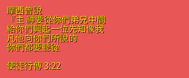 今日分享的中文聖經:「摩西曾說、『主 神要從你們弟兄中間、給你們興起一位先知像我、凡他向你們所說的、你們都要聽從。」來自聖經「使徒行傳」第「3章22節」,你可以繼續向下拉看到聖經卷書完整章節。每日中文聖經從神的話語中聆聽神的聲音,引導我們的人生,指導我們人生的方向,讓我們做出正確的選擇,而做出這些正確選擇的原則都在聖經中,所以我們需要讀神的話語,認識他的話語,把神的話語藏在心裡。