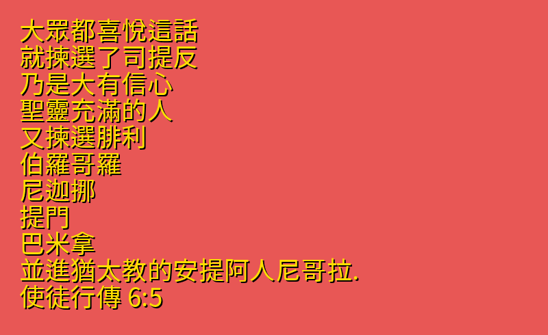 大眾都喜悅這話、就揀選了司提反、乃是大有信心、聖靈充滿的人、又揀選腓利、伯羅哥羅、尼迦挪、提門、巴米拿、並進猶太教的安提阿人尼哥拉.