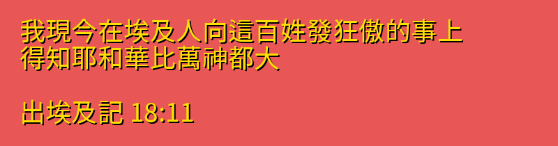 今日分享的中文聖經:「我現今在埃及人向這百姓發狂傲的事上、得知耶和華比萬神都大。」來自聖經「出埃及記」第「18章11節」,你可以繼續向下拉看到聖經卷書完整章節。每日中文聖經從神的話語中聆聽神的聲音,引導我們的人生,指導我們人生的方向,讓我們做出正確的選擇,而做出這些正確選擇的原則都在聖經中,所以我們需要讀神的話語,認識他的話語,把神的話語藏在心裡。