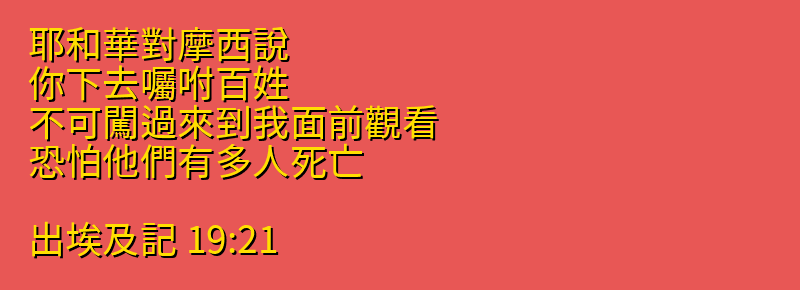 耶和華對摩西說、你下去囑咐百姓、不可闖過來到我面前觀看、恐怕他們有多人死亡。