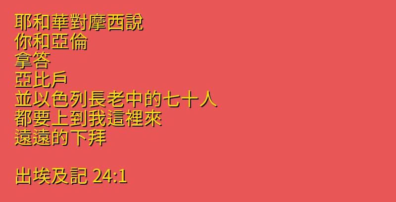 - 24:1 耶和華對摩西說、你和亞倫、拿答、亞比戶、並以色列長老中的七十人、都要上到我這裡來、遠遠的下拜。