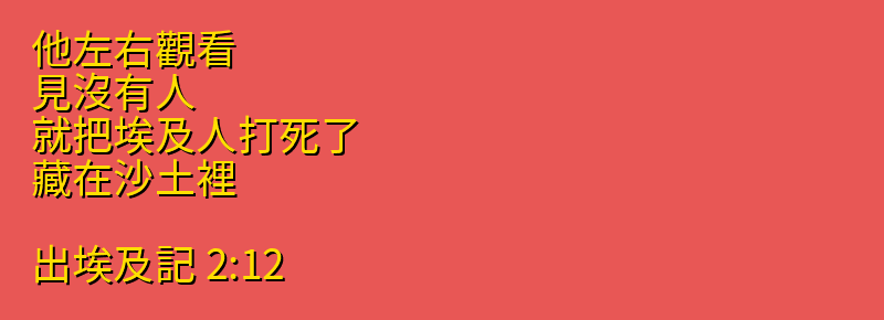 今日分享的中文聖經:「他左右觀看、見沒有人、就把埃及人打死了、藏在沙土裡。」來自聖經「出埃及記」第「2章12節」,你可以繼續向下拉看到聖經卷書完整章節。每日中文聖經從神的話語中聆聽神的聲音,引導我們的人生,指導我們人生的方向,讓我們做出正確的選擇,而做出這些正確選擇的原則都在聖經中,所以我們需要讀神的話語,認識他的話語,把神的話語藏在心裡。