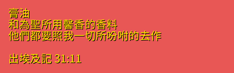 今日分享的中文聖經:「膏油、和為聖所用馨香的香料、他們都要照我一切所吩咐的去作。」來自聖經「出埃及記」第「31章11節」,你可以繼續向下拉看到聖經卷書完整章節。每日中文聖經從神的話語中聆聽神的聲音,引導我們的人生,指導我們人生的方向,讓我們做出正確的選擇,而做出這些正確選擇的原則都在聖經中,所以我們需要讀神的話語,認識他的話語,把神的話語藏在心裡。