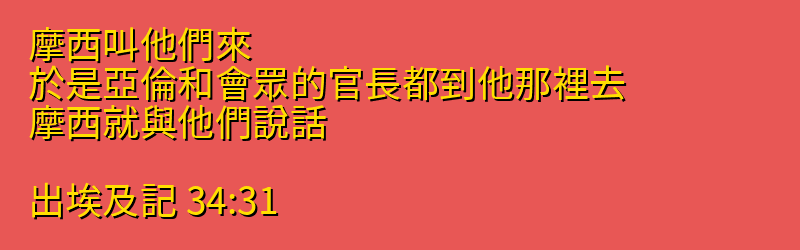 今日分享的中文聖經:「摩西叫他們來、於是亞倫和會眾的官長都到他那裡去、摩西就與他們說話。」來自聖經「出埃及記」第「34章31節」,你可以繼續向下拉看到聖經卷書完整章節。每日中文聖經從神的話語中聆聽神的聲音,引導我們的人生,指導我們人生的方向,讓我們做出正確的選擇,而做出這些正確選擇的原則都在聖經中,所以我們需要讀神的話語,認識他的話語,把神的話語藏在心裡。