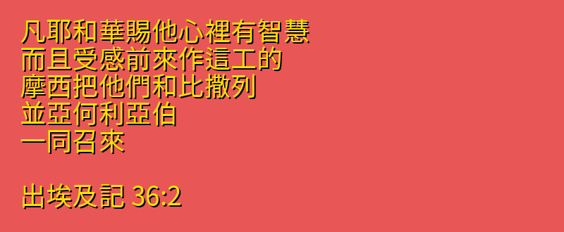 - 36:1 比撒列和亞何利亞伯、並一切心裡有智慧的、就是蒙耶和華賜智慧聰明、叫他知道作聖所各樣使用之工的、都要照耶和華所吩咐的作工。