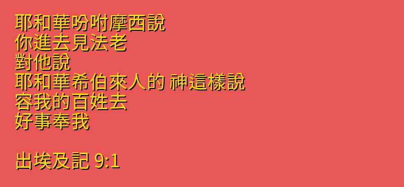 • 9:13 耶和華對摩西說、你清早起來、站在法老面前、對他說、耶和華希伯來人的 神、這樣說、容我的百姓去、好事奉我。