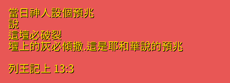 今日分享的中文聖經:「當日神人設個預兆、說、這壇必破裂、壇上的灰必傾撒.這是耶和華說的預兆。」來自聖經「列王記上」第「13章3節」,你可以繼續向下拉看到聖經卷書完整章節。每日中文聖經從神的話語中聆聽神的聲音,引導我們的人生,指導我們人生的方向,讓我們做出正確的選擇,而做出這些正確選擇的原則都在聖經中,所以我們需要讀神的話語,認識他的話語,把神的話語藏在心裡。