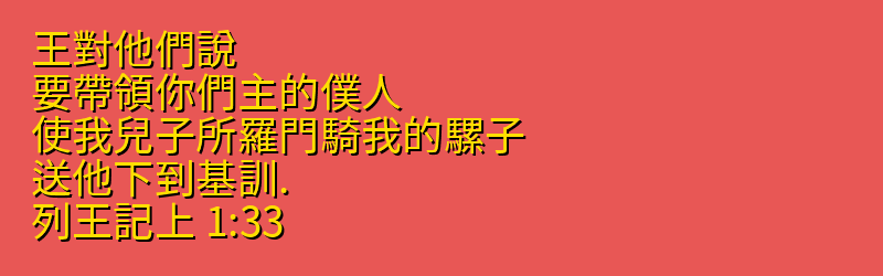 今日分享的中文聖經:「王對他們說、要帶領你們主的僕人、使我兒子所羅門騎我的騾子、送他下到基訓.」來自聖經「列王記上」第「1章33節」,你可以繼續向下拉看到聖經卷書完整章節。每日中文聖經從神的話語中聆聽神的聲音,引導我們的人生,指導我們人生的方向,讓我們做出正確的選擇,而做出這些正確選擇的原則都在聖經中,所以我們需要讀神的話語,認識他的話語,把神的話語藏在心裡。
