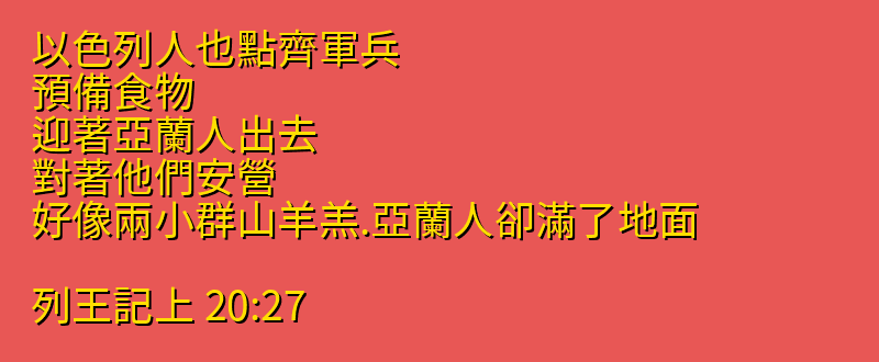 今日分享的中文聖經:「以色列人也點齊軍兵、預備食物、迎著亞蘭人出去、對著他們安營、好像兩小群山羊羔.亞蘭人卻滿了地面。」來自聖經「列王記上」第「20章27節」,你可以繼續向下拉看到聖經卷書完整章節。每日中文聖經從神的話語中聆聽神的聲音,引導我們的人生,指導我們人生的方向,讓我們做出正確的選擇,而做出這些正確選擇的原則都在聖經中,所以我們需要讀神的話語,認識他的話語,把神的話語藏在心裡。