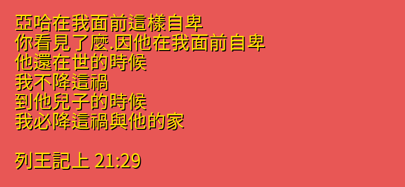 • 21:29 亞哈在我面前這樣自卑、你看見了麼.因他在我面前自卑、他還在世的時候、我不降這禍、到他兒子的時候、我必降這禍與他的家。