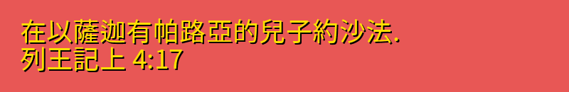 今日分享的中文聖經:「在以薩迦有帕路亞的兒子約沙法.」來自聖經「列王記上」第「4章17節」,你可以繼續向下拉看到聖經卷書完整章節。每日中文聖經從神的話語中聆聽神的聲音,引導我們的人生,指導我們人生的方向,讓我們做出正確的選擇,而做出這些正確選擇的原則都在聖經中,所以我們需要讀神的話語,認識他的話語,把神的話語藏在心裡。