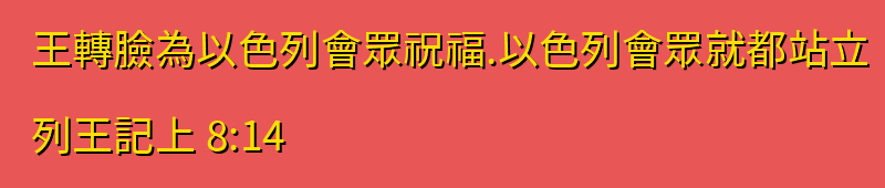 今日分享的中文聖經:「王轉臉為以色列會眾祝福.以色列會眾就都站立。」來自聖經「列王記上」第「8章14節」,你可以繼續向下拉看到聖經卷書完整章節。每日中文聖經從神的話語中聆聽神的聲音,引導我們的人生,指導我們人生的方向,讓我們做出正確的選擇,而做出這些正確選擇的原則都在聖經中,所以我們需要讀神的話語,認識他的話語,把神的話語藏在心裡。