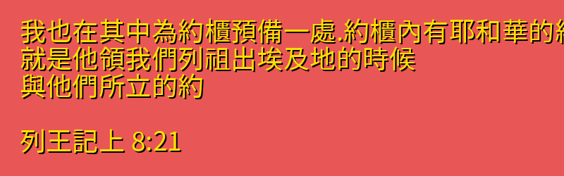 今日分享的中文聖經:「我也在其中為約櫃預備一處.約櫃內有耶和華的約、就是他領我們列祖出埃及地的時候、與他們所立的約。」來自聖經「列王記上」第「8章21節」,你可以繼續向下拉看到聖經卷書完整章節。每日中文聖經從神的話語中聆聽神的聲音,引導我們的人生,指導我們人生的方向,讓我們做出正確的選擇,而做出這些正確選擇的原則都在聖經中,所以我們需要讀神的話語,認識他的話語,把神的話語藏在心裡。