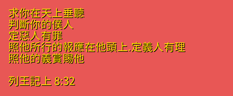 求你在天上垂聽、判斷你的僕人、定惡人有罪、照他所行的報應在他頭上.定義人有理、照他的義賞賜他。
