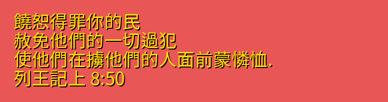 • 8:50 饒恕得罪你的民、赦免他們的一切過犯、使他們在擄他們的人面前蒙憐恤.