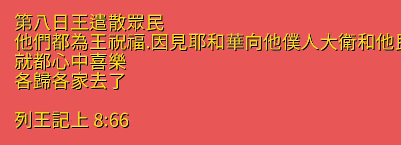 第八日王遣散眾民、他們都為王祝福.因見耶和華向他僕人大衛和他民以色列所施的一切恩惠、就都心中喜樂、各歸各家去了。