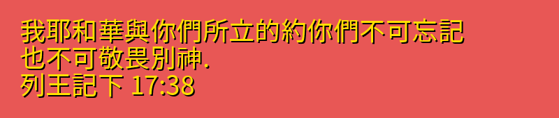 今日分享的中文聖經:「我耶和華與你們所立的約你們不可忘記、也不可敬畏別神.」來自聖經「列王記下」第「17章38節」,你可以繼續向下拉看到聖經卷書完整章節。每日中文聖經從神的話語中聆聽神的聲音,引導我們的人生,指導我們人生的方向,讓我們做出正確的選擇,而做出這些正確選擇的原則都在聖經中,所以我們需要讀神的話語,認識他的話語,把神的話語藏在心裡。