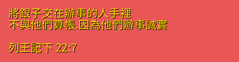 今日分享的中文聖經:「將銀子交在辦事的人手裡、不與他們算帳.因為他們辦事誠實。」來自聖經「列王記下」第「22章7節」,你可以繼續向下拉看到聖經卷書完整章節。每日中文聖經從神的話語中聆聽神的聲音,引導我們的人生,指導我們人生的方向,讓我們做出正確的選擇,而做出這些正確選擇的原則都在聖經中,所以我們需要讀神的話語,認識他的話語,把神的話語藏在心裡。