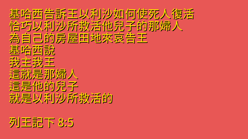 基哈西告訴王以利沙如何使死人復活、恰巧以利沙所救活他兒子的那婦人、為自己的房屋田地來哀告王。基哈西說、我主我王、這就是那婦人、這是他的兒子、就是以利沙所救活的。