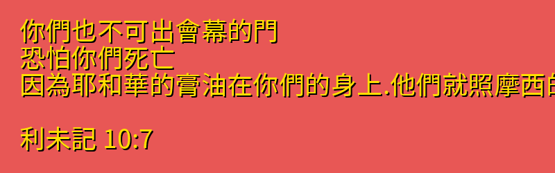 • 10:7 你們也不可出會幕的門、恐怕你們死亡、因為耶和華的膏油在你們的身上.他們就照摩西的話行了。