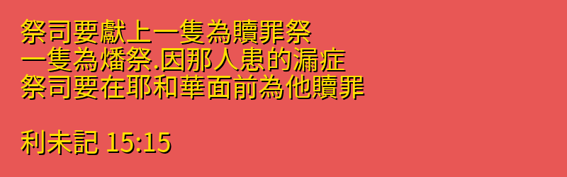 祭司要獻上一隻為贖罪祭、一隻為燔祭.因那人患的漏症、祭司要在耶和華面前為他贖罪。