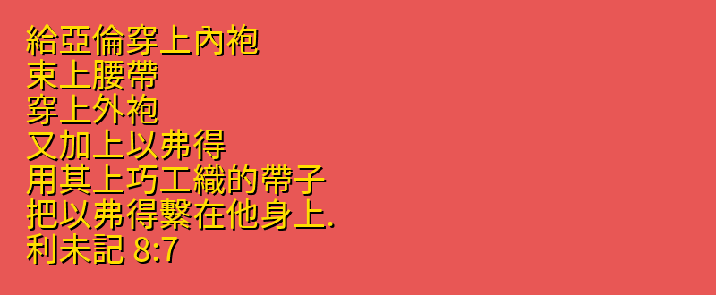 今日分享的中文聖經:「給亞倫穿上內袍、束上腰帶、穿上外袍、又加上以弗得、用其上巧工織的帶子、把以弗得繫在他身上.」來自聖經「利未記」第「8章7節」,你可以繼續向下拉看到聖經卷書完整章節。每日中文聖經從神的話語中聆聽神的聲音,引導我們的人生,指導我們人生的方向,讓我們做出正確的選擇,而做出這些正確選擇的原則都在聖經中,所以我們需要讀神的話語,認識他的話語,把神的話語藏在心裡。