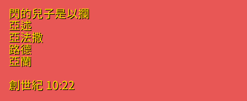 閃的兒子是以攔、亞述、亞法撒、路德、亞蘭。