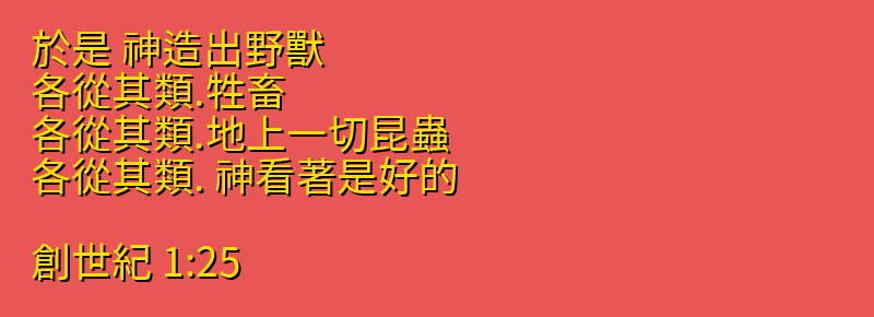 於是 神造出野獸、各從其類.牲畜、各從其類.地上一切昆蟲、各從其類. 神看著是好的。