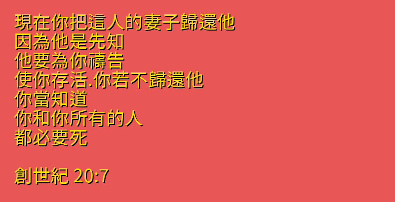 現在你把這人的妻子歸還他、因為他是先知、他要為你禱告、使你存活.你若不歸還他、你當知道、你和你所有的人、都必要死。