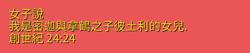 今日分享的中文聖經:「女子說、我是密迦與拿鶴之子彼土利的女兒.」來自聖經「創世紀」第「24章24節」,你可以繼續向下拉看到聖經卷書完整章節。每日中文聖經從神的話語中聆聽神的聲音,引導我們的人生,指導我們人生的方向,讓我們做出正確的選擇,而做出這些正確選擇的原則都在聖經中,所以我們需要讀神的話語,認識他的話語,把神的話語藏在心裡。