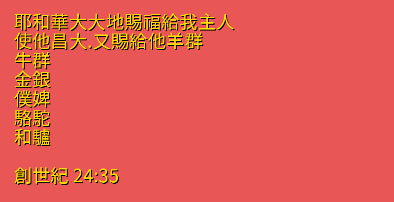 • 24:35 耶和華大大地賜福給我主人、使他昌大.又賜給他羊群、牛群、金銀、僕婢、駱駝、和驢。
