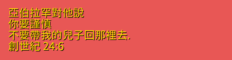 • 24:6 亞伯拉罕對他說、你要謹慎、不要帶我的兒子回那裡去.