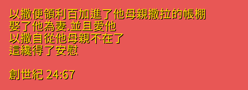 • 24:67 以撒便領利百加進了他母親撒拉的帳棚、娶了他為妻.並且愛他。以撒自從他母親不在了、這纔得了安慰。
