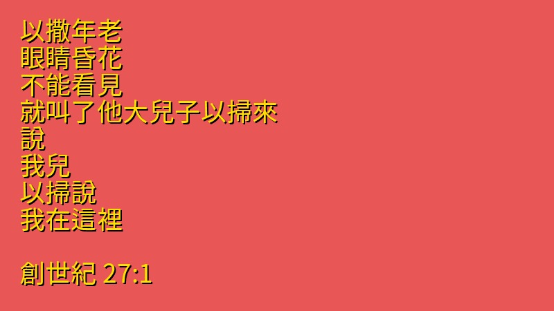 - 27:1 以撒年老、眼睛昏花、不能看見、就叫了他大兒子以掃來、說、我兒、以掃說、我在這裡。