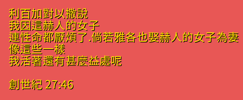 利百加對以撒說、我因這赫人的女子、連性命都厭煩了.倘若雅各也娶赫人的女子為妻、像這些一樣、我活著還有甚麼益處呢。