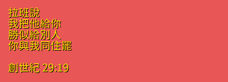 今日分享的中文聖經:「拉班說、我把他給你、勝似給別人、你與我同住罷。」來自聖經「創世紀」第「29章19節」,你可以繼續向下拉看到聖經卷書完整章節。每日中文聖經從神的話語中聆聽神的聲音,引導我們的人生,指導我們人生的方向,讓我們做出正確的選擇,而做出這些正確選擇的原則都在聖經中,所以我們需要讀神的話語,認識他的話語,把神的話語藏在心裡。