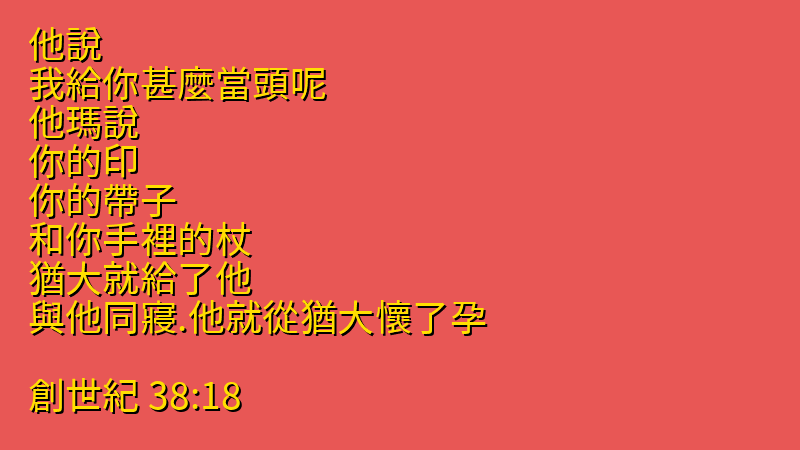 他說、我給你甚麼當頭呢、他瑪說、你的印、你的帶子、和你手裡的杖。猶大就給了他、與他同寢.他就從猶大懷了孕。