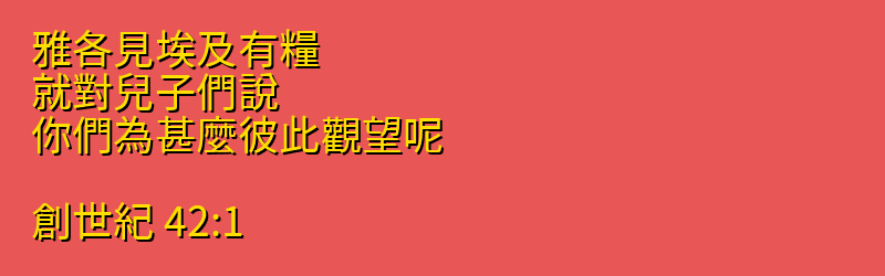 今日分享的中文聖經:「雅各見埃及有糧、就對兒子們說、你們為甚麼彼此觀望呢。」來自聖經「創世紀」第「42章1節」,你可以繼續向下拉看到聖經卷書完整章節。每日中文聖經從神的話語中聆聽神的聲音,引導我們的人生,指導我們人生的方向,讓我們做出正確的選擇,而做出這些正確選擇的原則都在聖經中,所以我們需要讀神的話語,認識他的話語,把神的話語藏在心裡。