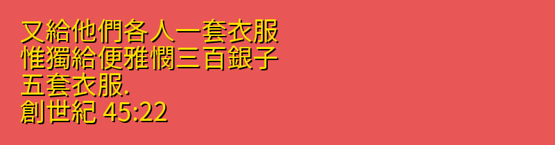 又給他們各人一套衣服、惟獨給便雅憫三百銀子、五套衣服.